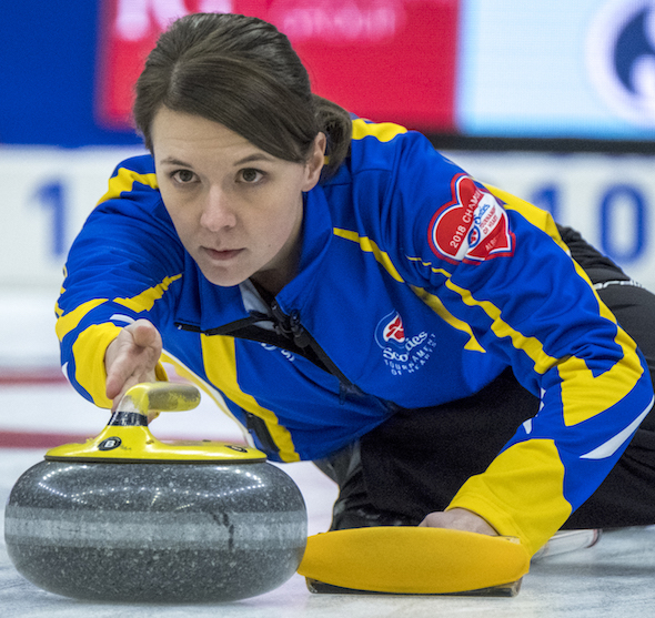 Previous Image Next Image 3 Team Alberta skip Casey Scheidegger in draw five action at the 2018 Scotties Tournament of Hearts, the Canadian Womens Curling Championships, the South Okanagan Events Centre, Penticton, British Columbia